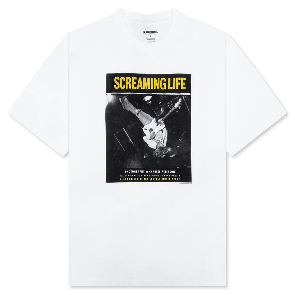 Neighborhood and famous photographer, Charles Peterson, come together to capture the grunge scene with the S/S Tee 1. Cut from cotton with a relaxed fit, it features a ribbed crew neckline making the tee comfortable and timeless. Showcased at the front is artwork from Charles Peterson's photo book, Screaming Life, while a signature Neighborhood logo sits at the back. - 100% Cotton - Relaxed fit - Crew neckline - Ribbed collar - Screen-printed graphics - Style No: 252PCNH-ST10S-WHT