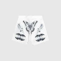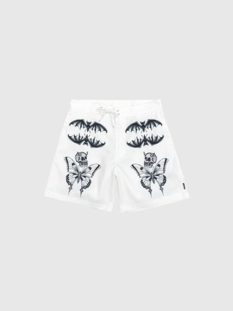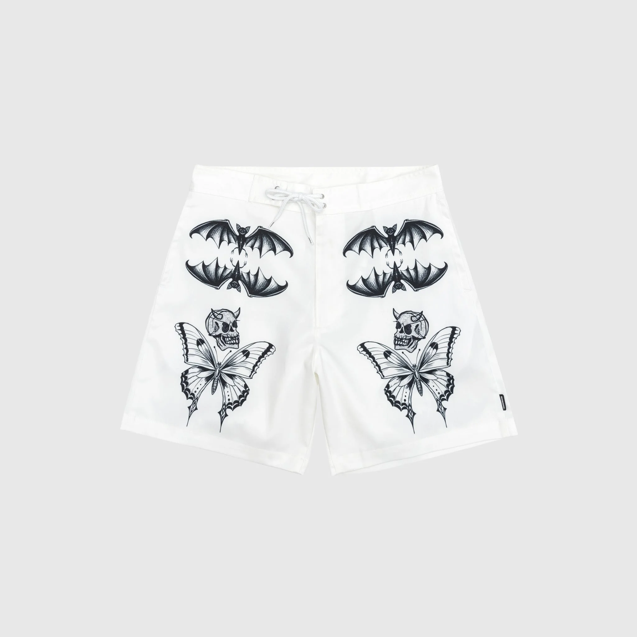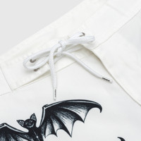 - 241TSDWN-PTM01S-WHT - White - 100% Polyester - Line drawing graphics created by Tattoo artist Dr. WOO - Adjustable drawstring waist - Two side welted pockets - Back pocket with zipper closure - Label at the side seam