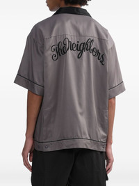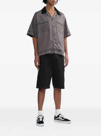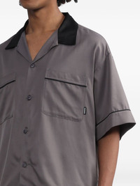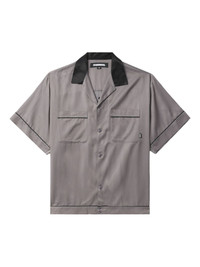short-sleeve pocket bowling shirt Highlights - Grey - Short sleeves - Revere collar - Two chest pockets - Button fastening - Black piping Imported Composition Rayon 65%, Cotton 35% Washing instructions Read Manufacturer Guidelines