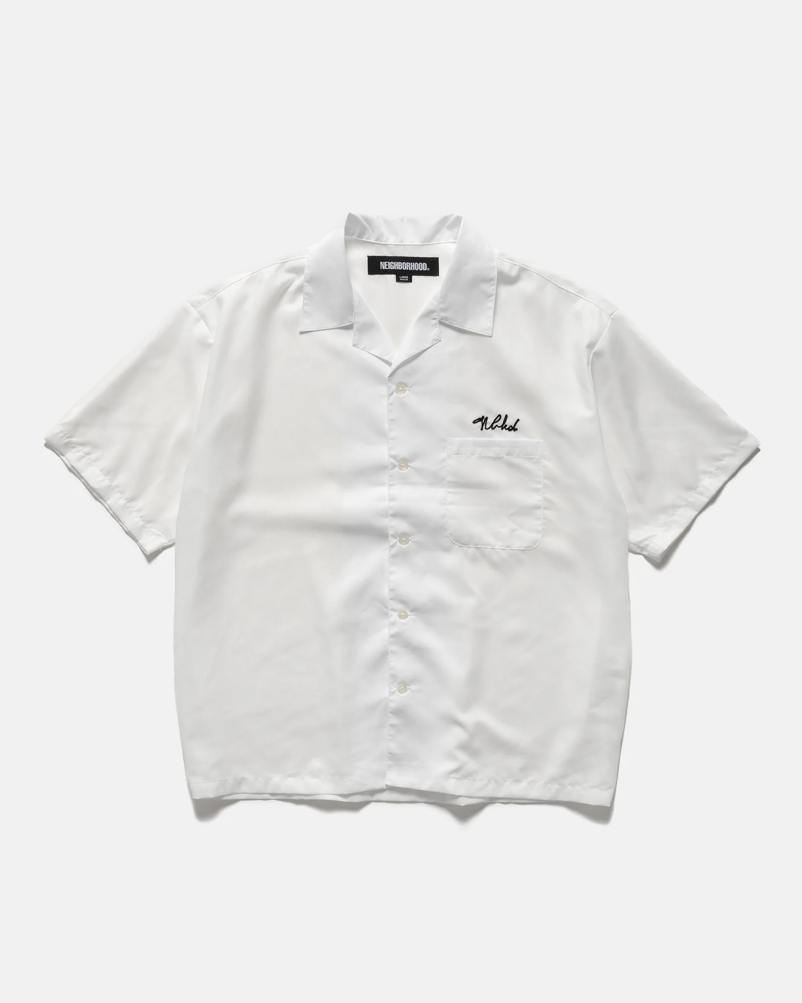 Designed for warm weather ease, this solid-color Hawaiian shirt blends laid-back comfort with refined construction. Made from soft polyester poplin that mimics the feel of natural fiber, it offers a fluid drape with durable resilience. The open collar and relaxed fit offer a breezy summer silhouette while subtle chain stitch embroidery help to balance the minimal design with signature NEIGHBORHOOD character. DETAILS - 251TSNH-SHM07 - 100% Polyester - Relaxed, boxy fit - Open collar - Button closure - Patch chest pocket - Tonal embroidered logo at chest - Brand label at side seam - Made in Philippines