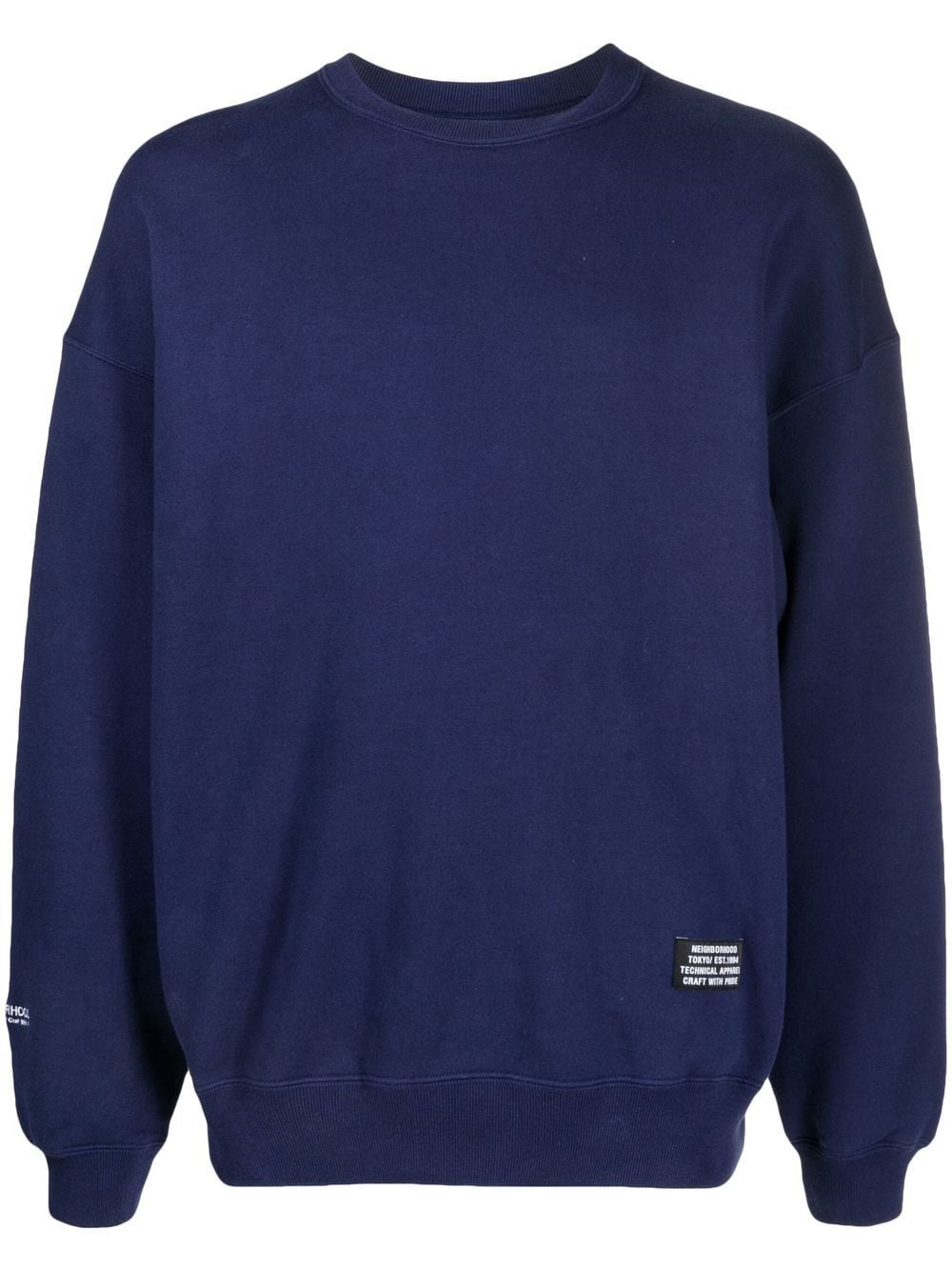 logo-patch detail sweatshirt logo-patch detail sweatshirt from NEIGHBORHOOD featuring navy blue, cotton, ribbed detailing, logo patch to the front, round neck, long sleeves and straight hem. Imported Composition Cotton 100% SIZE & FIT Model measurements Height 6 ft 1 in(1.86 m) Bust/Chest 35.8 in(91 cm) Hips 36.6 in(93 cm) Waist 28.3 in(72 cm) FittingInformation This piece fits true to size. We recommend you get your regular size Cut for a loose fit Made with a mid-weight fabric