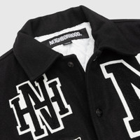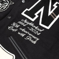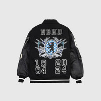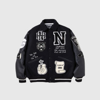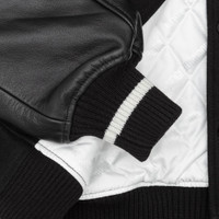 - 242SZNH-JKM07-BLW - Black/White - 90% Wool, 10% Polyester - Lining: 100% Polyester - Sleeves: 100% Cow leather - Front snap button closure - Two front welted pockets - Chenille patches throughout - Embroidery applications throughout - Ribbed cuff and waist - Woven label at the front