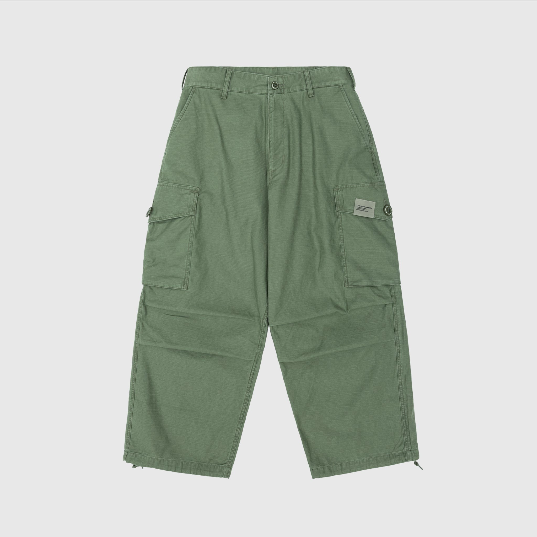 - 251SPNH-PTM06-OLV - Olive Drab - 100% Cotton - Bio-stone washed - Front zipper and button closure - Two front side welted pockets - Two cargo pockets with flap and button closure - Two back pockets with flap and button closure - Woven label at the back - Adjustable drawstring cuffs - Woven label at the front - Darted knees - Relaxed fit - Made in Japan