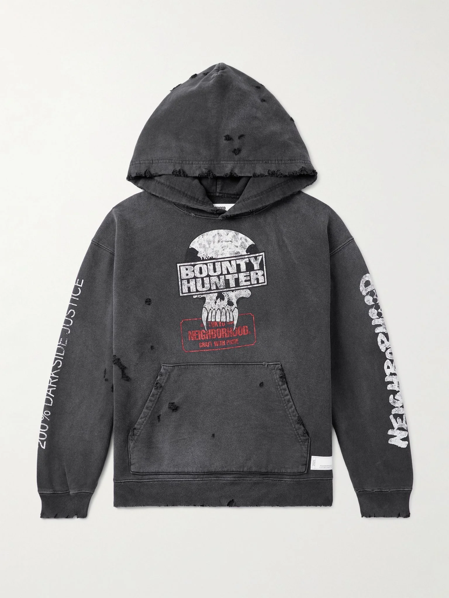 Since the 1990s, Tokyo's Ura-Harajuku district has produced some of the biggest brands in Japan, like Neighborhood and Bounty Hunter. Designed in collaboration with the latter, this 'Savage' hoodie is made from washed-out cotton-jersey that's heavily distressed with rips, cuts and tears and printed with co-signed logos at the chest. Small to size. See Size & Fit notes. Size & Fit - Fits small to size. Take one size larger than normal - Designed for a relaxed cut - Dropped shoulder seam - Mid-weight, slightly stretchy fabric - Model is shown wearing a M - Model measures: chest 38"/ 96cm, height 6'1"/ 185cm Details & Care - Black, white and red cotton-jersey - 100% cotton - Machine wash