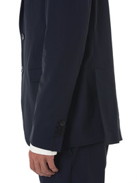 Neil Barrett suit in dark navy featuring a single-breasted blazer with a notched lapel, jetted breast pocket, flap patches with sealed welt details, three-button cuffs, darted back, and dual vents at rear hemline. Accompanying trousers feature a hook-and-eye enclosure, hip pockets, buttoned welt rear pockets, darting along pant legs, and tonal stitching on a relaxed fit. 61% Cupro, 35% Cotton, 4% Polyurethane Model wears a size 50.