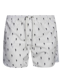 lightning bolt-print swim shorts Highlights - White/black - Lightning-bolt print - Drawstring fastening - Elasticated waistband - Straight hem - Be mindful to try on swimwear over your own garments. Imported Composition Polyester 100% Washing instructions Read Manufacturer Guidelines