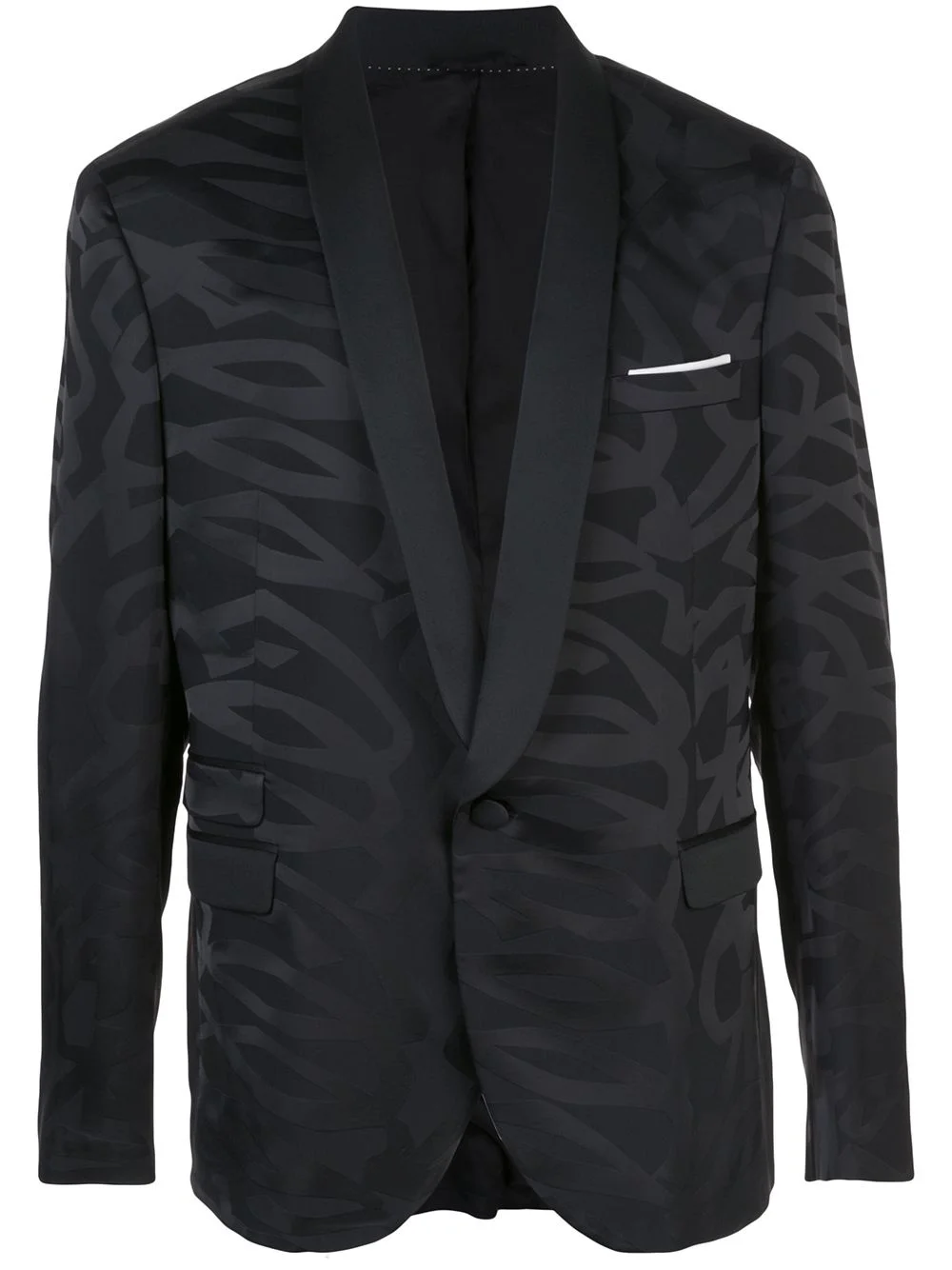 patterned satin jacket Black patterned satin jacket from Neil Barrett featuring narrow lapels, a front button fastening and a graphic print. Made in Italy Composition Polyester 100%, Viscose 97%, Elastane 3% Lining: Cupro 60%, Viscose 34%, Elastane 8% SIZE & FIT Model measurements Height 6 ft 2 in(1.88 m) Bust/Chest 38.18 in(97 cm) Hips 37 in(94 cm) Waist 29.92 in(76 cm) Washing instructions Dry Clean Only