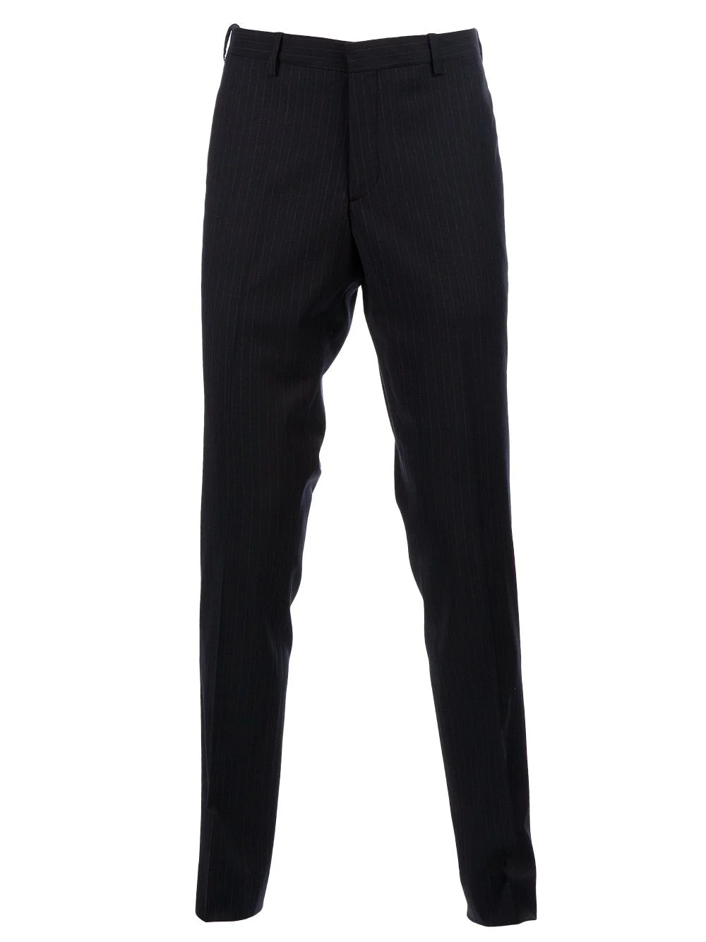 Pin striped trouser Black cotton blend trouser from Neil Barrett featuring a straight leg design, a concealed front fastening, belt loops at the waist, a contrasting grey pin striped design, two side inset pockets and a single pleat design to the front and rear. Made in Italy Composition Wool 98%, Spandex/Elastane 2% Washing instructions Dry Clean Only