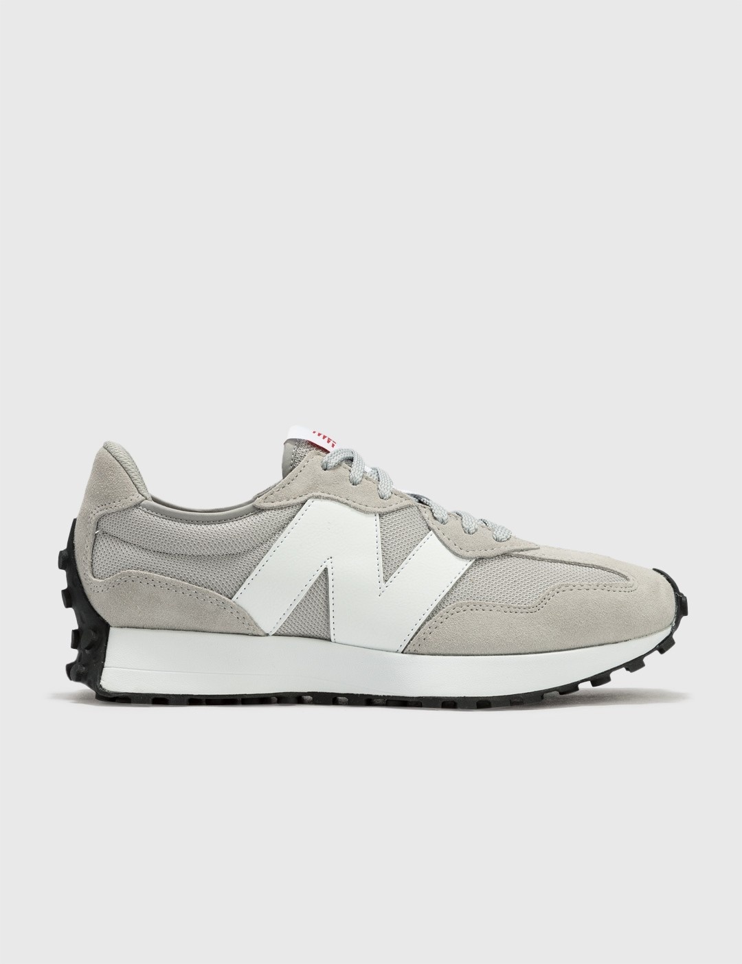 - New Balance - 327 - Suede and mesh upper - Lace-up closure - Oversized N Logo at side - Rubber heel wrap - Lugged rubber outsole - Color: Rain Cloud/White - Material: Suede, Mesh, Rubber - See more - Sneakers - and - Shoes