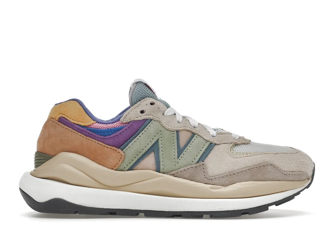 The New Balance 57/40 Calm Taupe arrives in a calm taupe, vibrant apricot colorway. The New Balance 57/40 Calm Taupe adopts a classic silhouette with a mix of taupe and ivory with blue, light green, and brown accents. The upper is constructed of breathable mesh with synthetic overlays for stability and comfort. The shoe upper features a stitched, light green, textured N logo on the lateral sides and an "NB" branding on the tongue. The midsole is constructed from lightweight EVA foam for padding and comfort, while the shoe’s black rubber outsole offers traction and stability. The New Balance 57/40 Calm Taupe was released on May 13th, 2022, and for a retail price of $120. - Style M5740SSP - Colorway Calm Taupe/Vibrant Apricot - Retail Price 120 - Release Date 2022-05-13 - Featured false