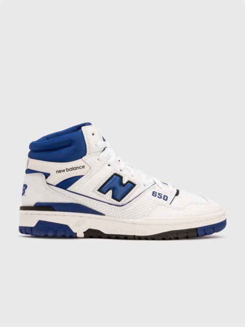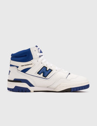 - New Balance - 650 - Hi-top sneaker - Leather upper - Signature N Logo on side - Branded tongue and collar - Padded heel - OrthoLite® insole - Puff and stitch collar - Lace-up closure - Color: White/Blue - Style Code: BB650RWND - Material: Leather, Textile, Rubber - See more Sneakers and Shoes