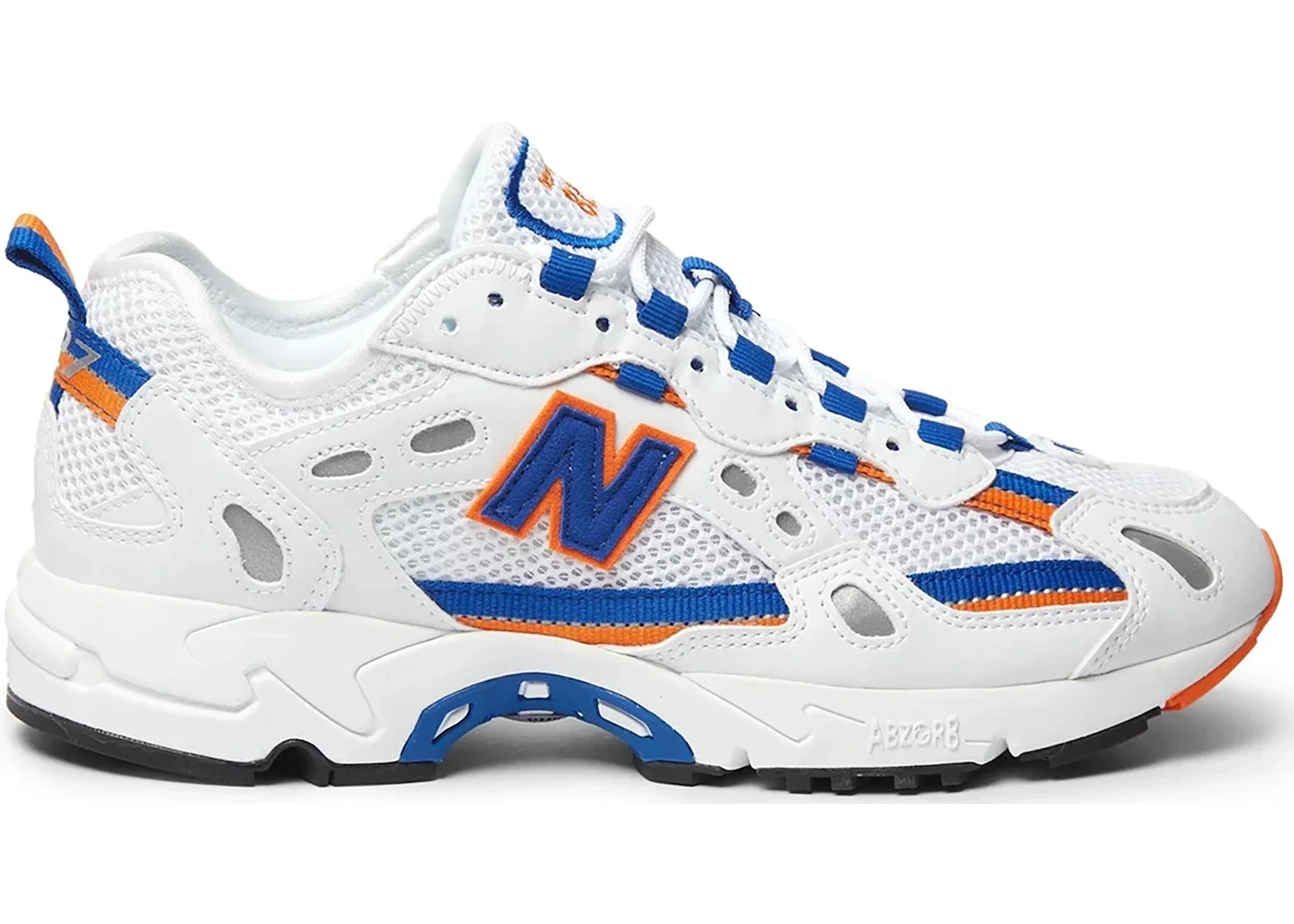The New Balance 827 Abzorb OG Blue is a retro-inspired sneaker from the New Balance 827 Abzorb lineup in its original colorway. White dominates the upper, which features a mesh base with leather overlays. Orange and Blue accents on the signature ‘N’ logo, heel pull tab, and different synthetic webbing straps throughout the upper provide a contrasting tone. Reflective Silver detailing on the toe and quarter panels provides visibility in low-light conditions. A White ABZORB-cushioned midsole separated on the heel and forefoot by a Blue TPU midfoot shank sits on a Black/White/Orange rubber outsole. The New Balance 827 Abzorb OG Blue was released on April 2nd, 2020, for a retail price of $145. - Style ML827AAA - Colorway White/Orange-Blue - Retail Price 145 - Release Date 2020-04-02 - Featured false