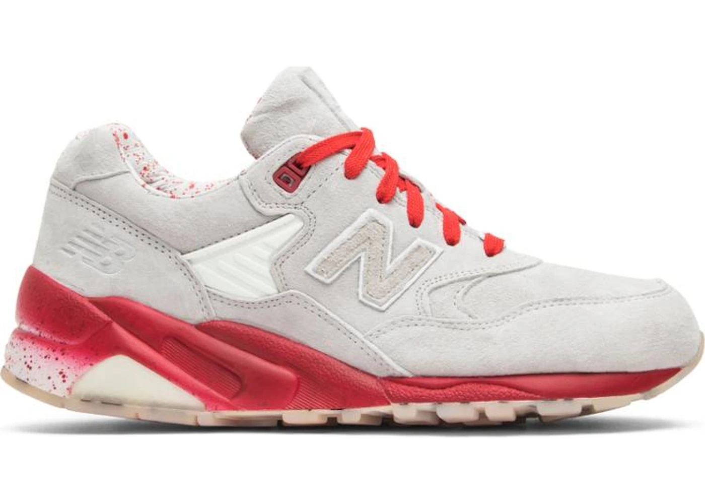 The New Balance 580 Bait Storm Shadow is a collaborative BAIT, Hasbro, and New Balance sneaker from the BAIT x G.I. Joe x New Balance 580 "Arashikage" Pack. This iteration of the MT580 comes dressed in an Off-White suede upper with Red accents on the laces, gradient midsole, and inner lining. Red speckles symbolizing blood splatter feature on the midsole heel and inner lining. Other details include a heat-debossed ‘NB’ logo on the lateral heel, tongue branding, and a tonal ‘N’ logo with a White outline on the sides. The iconic Arashikage symbol features on the heel tab and lace lock. A translucent rubber outsole completes the design. The New Balance 580 Bait Storm Shadow was released on October 10th, 2015, for a retail price of $160. - Style MT580GI2 - Colorway White/Arashikage Red - Retail Price 160 - Release Date 2015-10-10 - Featured false