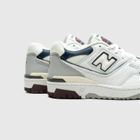 - BB550PWB - White/Natural Indigo/Burgundy - Originally released in 1989, the surprise-hit New Balance 550 has made a return as a low-top basketball-turned-lifestyle sneaker - Leather upper with mesh accents - Perforated leather details - New Balance branding featured on the tongue, side, heel, collar, sock liner, and outsole - Lace closure - Rubber outsole