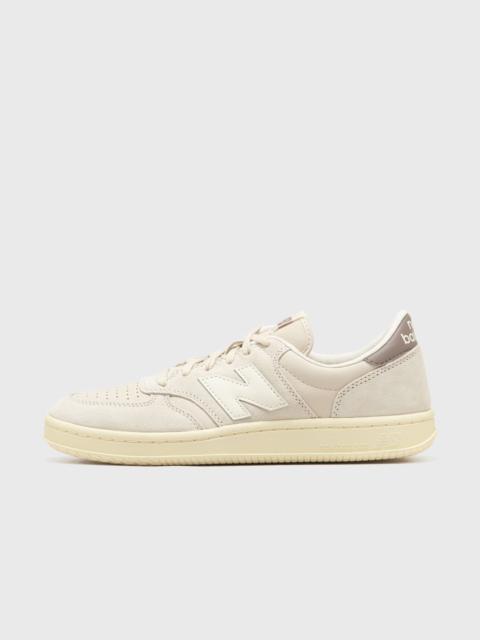 Straight from the rich archives of the Boston label, the New Balance T500 celebrates its well-deserved comeback: originally launched as a tennis shoe in 1982, the silhouette impresses with an upper made of pigskin and nubuck leather. The rubber midsole subtly alludes to the technology of the 1980s and thus stands out from the vulcanized soles of older court models. - Outsole with herringbone pattern and pivot circle - Woven tongue label - Perforated toe area - Upper made of high-quality pig suede and nubuck - Rubber midsole/outsole - Cushioned polyurethane footbed Article Number: CT500SKB Gender: Men Color: Timberwolf Material: 30% Rubber, 70% Leather