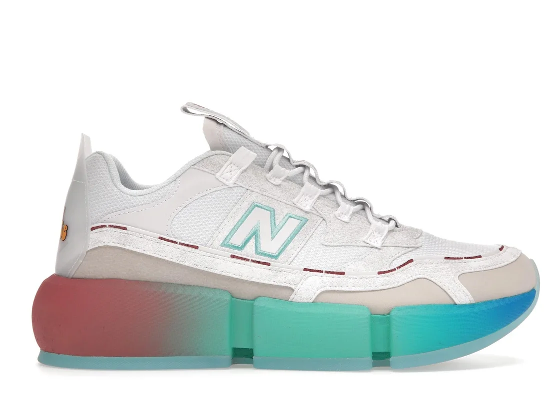The New Balance Vision Racer Jaden Smith Trippy Summer Jade was released as part of the collaborative collection between New Balance and Jaden Smith. It comes in a White" upper and has a variety of supplementary tones and details from the 1970s inspiration. Everything from the profile "N" emblems to the model's mudguard is animated in blue, orange, and green colors. The summer jade colors cover its bulky, segmented midsole. On the tongue pull tab's "VISION RACER" and the heel's "NEW BALANCE" inscription, respectively, a vintage font replaces the conventional one. Finally, to complete the pair's look, the semi-translucent outsole is adorned with the NB logo. The New Balance Vision Racer Jaden Smith Trippy Summer Jade was released on 30th July 2021 and retailed at $150. - Style MSVRCJWB - Colorway White/Summer Jade - Retail Price 150 - Release Date 2021-07-30 - Featured false