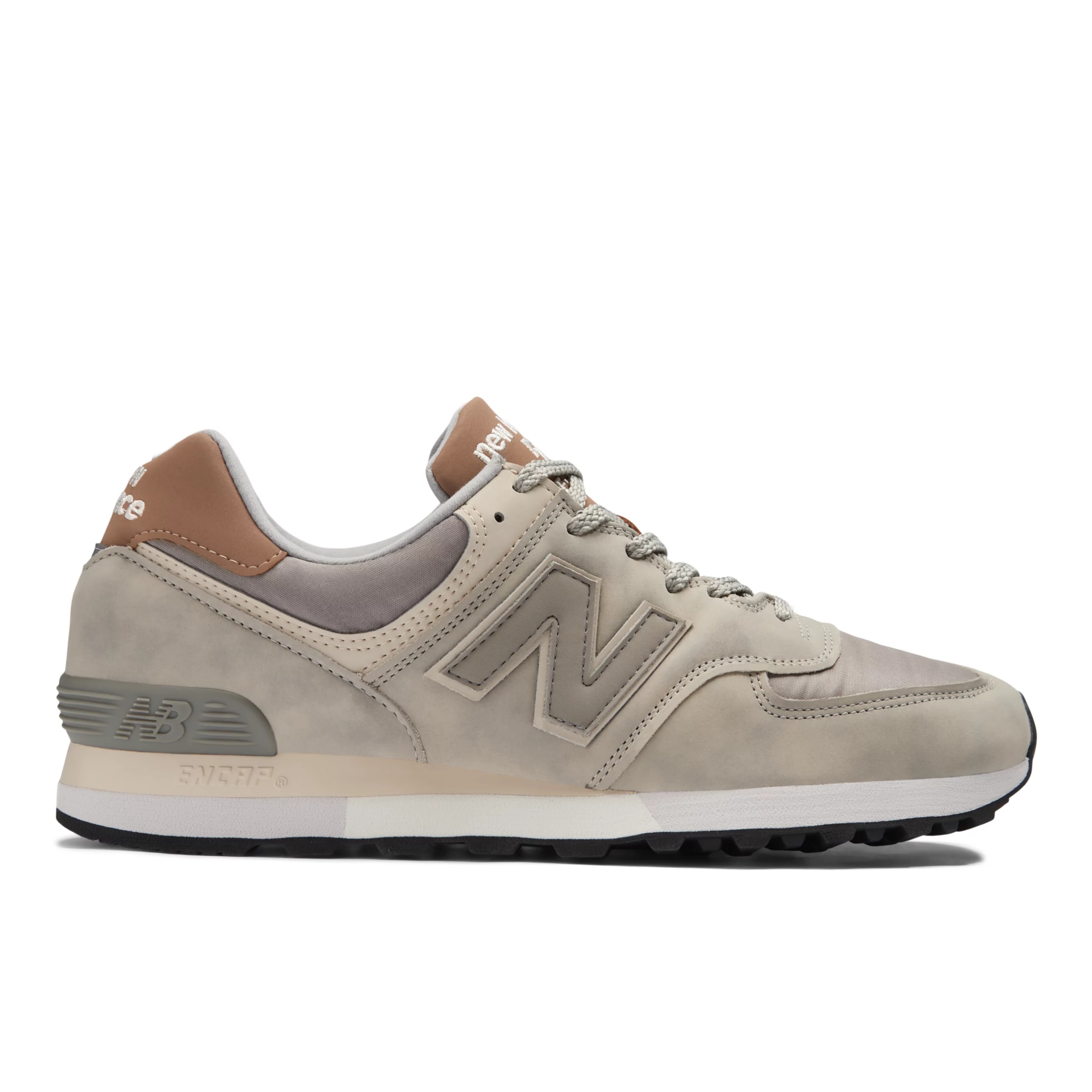While the MADE in UK 576 is iconic in any form, the ‘Nostalgic Sepia’ edition takes visual cues from a distinctive source of inspiration. A nylon upper, overlaid with premium nubuck, is executed in grey tones, with bronze accents at the tongue and heel providing a touch of contrast. The nubuck’s subtle mottled effect is inspired by the patina of aged photographs, giving each pair a unique appearance. Product Details Features - Mottled color on nubuck gives each pair a unique appearance - Embroidered 'Made in England', '576', and 'New Balance' text at tongue - Embroidered 'New Balance' text at heel - Classic ENCAP midsole cushioning combines soft foam with a durable polyurethane rim - Heel CR device - Graphic sockliner - 363.3 grams (12.8 oz) Material - Premium nubuck overlays - Nylon upper Style #: OU576GT