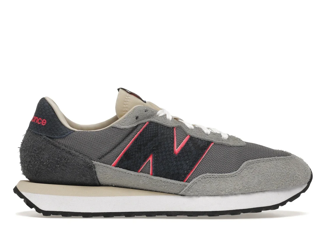 The New Balance 237 SNS Blue Racer features a grey CORDURA mesh upper with hairy suede overlays and a Blue Racer snakeskin accent on the side New Balance emblems and heel tabs. A cream and white midsole with a Blue Racer outsole completes the design. The New Balance 237 SNS Blue Racer released in June of 2021 and retailed for $145. - Style MS237NS - Colorway Grey/Blue/Pink - Retail Price 145 - Release Date 2021-06-11 - Featured false