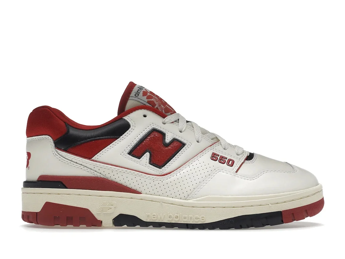 The New Balance 550 Aime Leon Dore White Red features a white and red leather upper with a primarily white base broken up by dark red at the collar. From there, a smaller, blockier New Balance logo of New Balance and an aged-look midsole atop a red outsole with dark navy accents complete the design. The New Balance 550 Aime Leon Dore White Red released in October of 2020 and retailed for $130. - Style BB550AE1 - Colorway White/Red - Retail Price 130 - Release Date 2020-10-09 - Included Accessories Red extra laces, Cream extra laces - Featured false