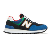 Bringing bold tooling to the retro silhouette, the 574 Rugged 'Black Captain Blue' features vibrant accents. The shoe's mesh upper is overlaid by a mix of suede and leather, finished in white, black, Captain Blue and green, with red highlighting the inner lining. Orange emerges on the 'N' logo outline, with a solid white Encap midsole offering cushioning underfoot. A lugged rubber outsole is included for traction. SKU: ML574DRC Colorway: Black/Captain Blue Release Date: 3/23/21