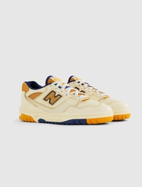Low top sneakers. Leather upper. Perforated toe box. Leather overlay around the toe. Leather side panels, and heel counter. Cutout mesh logos on the side panels. Front lacing. Nylon mesh tongue, and collar. Stamped logo on the heel. Rubber midsole. Rubber outsole. - Leather upper SKU: BB550AX1