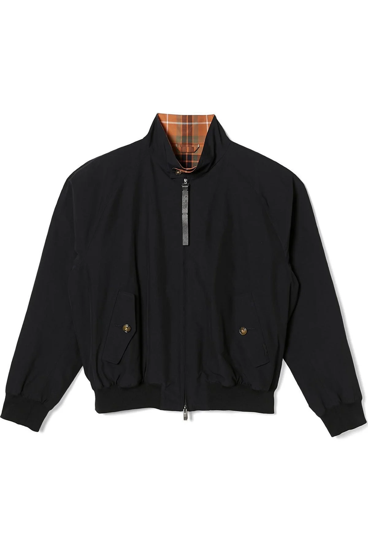 - Based on BARACUTA’s iconic “G9”Harrington jacket. - Designed with a reversible construction. The length has been shortened from the longest available size of the “G9” for a boxier silhouette. - Inspired by tracksuits, the ribbed hem has been adjusted for a stronger tension. - The neckline is widened, allowing the lining to peek through as a design accent. - The two-way front zipper features an original N.HOOLYWOOD leather pull tab with an engraved logo, while the buttons retain BARACUTA’s original design. - Additionally, BARACUTA’s signature kite string reinforcement is incorporated into the placket to prevent the zipper slider from snagging. - A mini pocket for care labels is intentionally placed on the check-patterned side, beneath the back hem ribbing. - A double-name tag is attached inside the pocket. - Relaxed, boxy silhouette. - BARACUTA’s signature check pattern has been enlarged to create an exclusive collaboration design. - A 50/50 cotton-poly blend Barracuda cloth with excellent water resistance and breathability. Features a matte texture with a firm hand. - Color: Dark Navy - 58% cotton, 42% polyester - Made in Vietnam - Model is 6'2 wearing a size 40