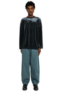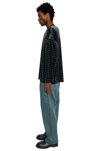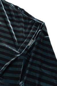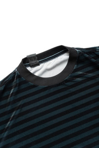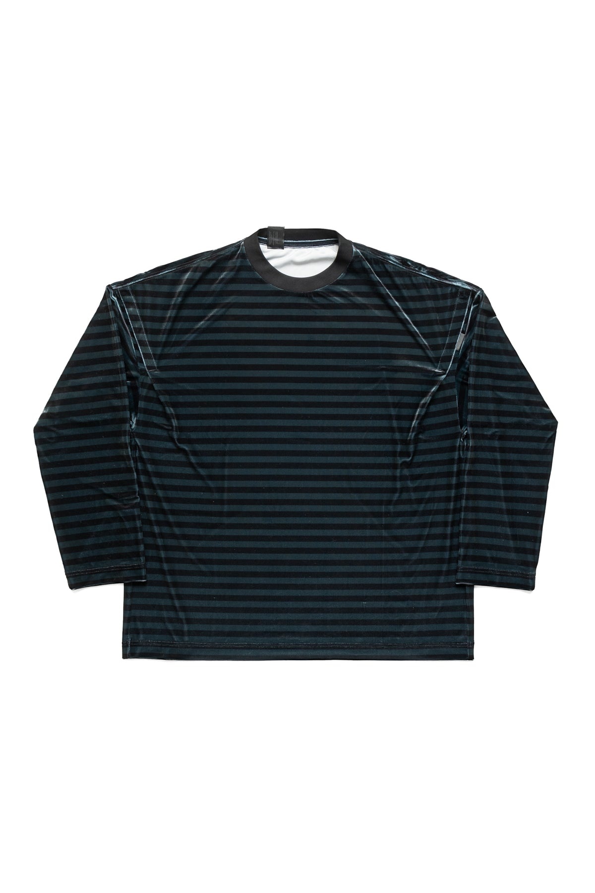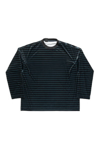 - Moderately high neckline. Single tuck at the shoulder sleeve attachment point with a sandwiched brand label design. The black brand name, an icon of N.HOOLYWOOD COMPILE, is placed on the left sleeve. - Drop shoulders, relaxed boxy silhouette - A glossy velvet material featuring an original stripe created and transferred through print. - Color: Black - Made in Japan - Model is 6'2 wearing a size 38