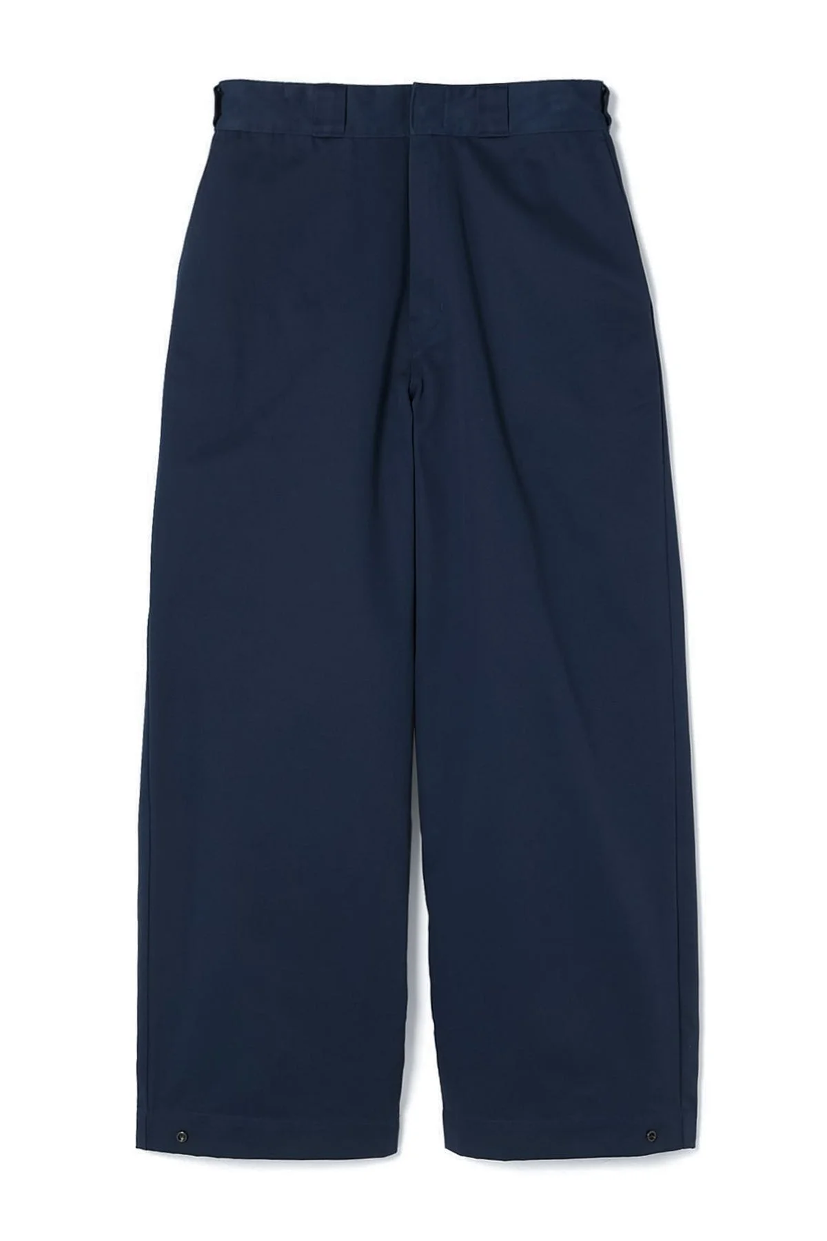 - N.HOOLYWOOD x Dickies - Features the signature TC twill from Dickies. A firm fabric with a washed finish for a softer, more comfortable feel. - Wide pants made with Dickies’ signature twill fabric. - The front is designed with concealed snap buttons. - The waistband features an internal elastic band along with a drawcord for precise adjustments. - Snap buttons are also placed at the hem. - A hammer pocket is positioned on the right thigh, with a tonal embroidered Dickies logo. - The back of the waistband has a Dickies tag, and an N.HOOLYWOOD COMPILE tag is attached to the pocket. - A collaboration-exclusive “2252 Relax Fit” print is featured on the pocket lining. - Softly curved patterning. - Wide, tapered silhouette. - Color: Navy - 65% polyester, 35% cotton - Model is 6'2 wearing a size 40