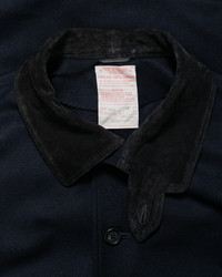 Worsted Tasmanian horse riding melton wool. Now while most of you will think of Looney tunes when you see this, we're about to get a little deeper. What makes this jacket special is the worsted process the wool goes through. Instead of combing the wool making it fluffier, the fibers are all aligned in the same direction, resulting in a smooth, strong, and durable fabric. The wool is finer and denser, making it even more luxurious that it already is. This is a coat that will quickly become one of the best pieces you'll own in your wardrobe. Absolutely no DOUBT about it. DETAILS - Worsted Tasmanian horse riding melton wool - Inspired by clothing worn by US Navy submariners from 1930s to 1950s - Tuscan suede collar & sleeve lining - Suede collar & throat tab - Button flap hip pockets - Button closure - 100% wool, 60% polyester 40% cupro sleeve lining, cow leather - Made in Japan - Model is 6’2” (189cm), 160lbs (73kg) and wearing XL