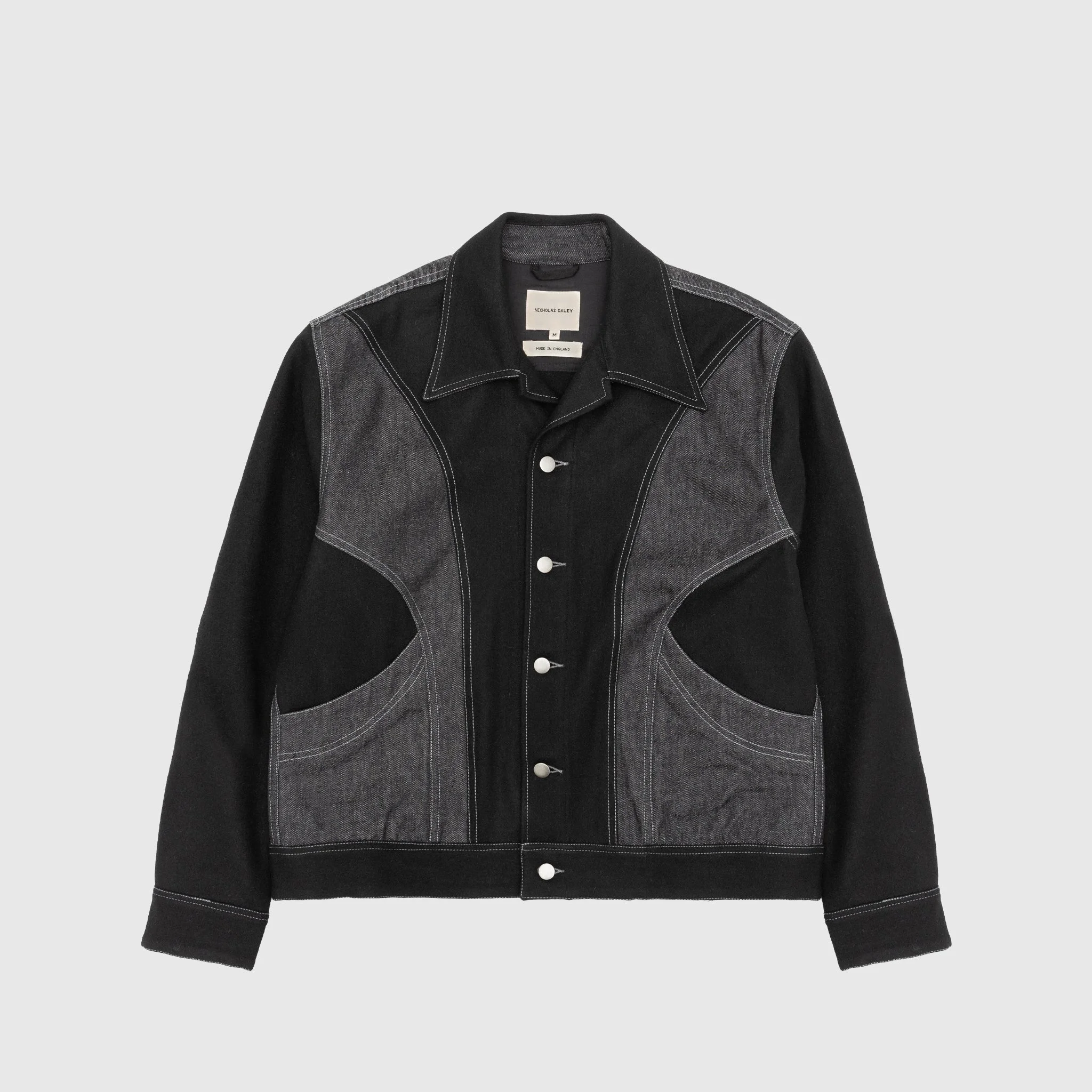 - ND-AW24-RBJ1-WOCO-BK - Black - 100% Cotton - Contrast: 100% Wool - Linning: 100% Cotton - Paneled design - Front button closure - Pointed collar - Two front pockets - Contrast stitching throughout - Leather branded patch at the back - Adjustable button cuffs - Made in England