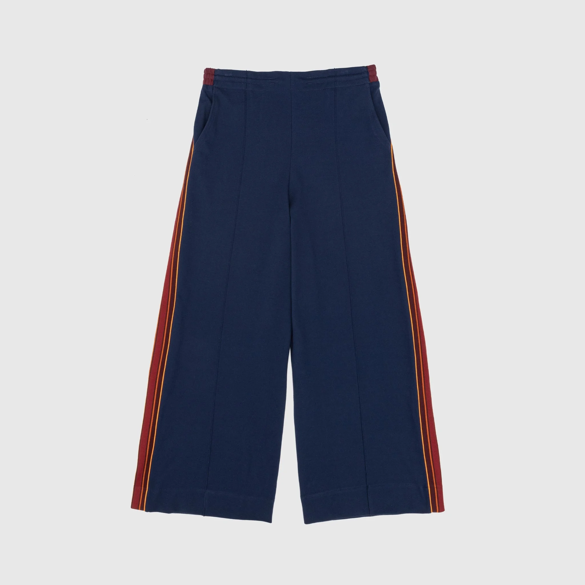 - ND-AW24-WLTP1-C-NVBG - Navy/Burgundy - 100% Cotton - Ribbing: 95% Cotton, 5% Elastic - Elastic waistband with adjustable drawstring - Two side welted pockets - Chain stitch detailing at the back - Contrast ribbing along the pant leg - Pleated front - Wide fit