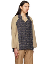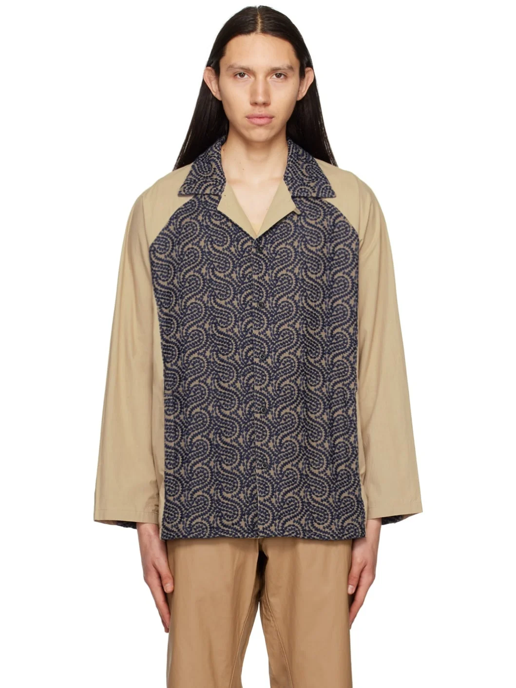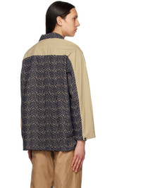Cotton poplin shirt. Graphic pattern embroidered throughout. · Paneled construction · Open spread collar · Button closure · Welt pockets · Tennis-tail hem · Single-button barrel cuffs Supplier color: Beige/Navy Body: 100% cotton. Trim: 100% polyester. Made in Japan 231363M192000