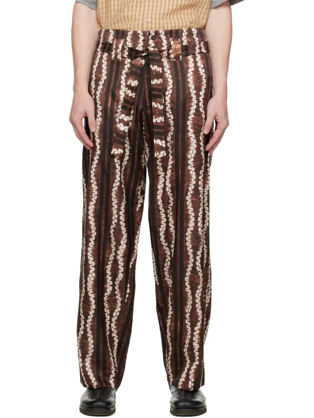 Relaxed-fit rayon and cotton-blend sateen trousers. Roketsu-dyed graphic pattern throughout. · Integrated self-tie belt and belt loops · Three-pocket styling · Zip-fly Supplier color: Brown/Ecru roketsu Body: 52% rayon, 48% cotton. Lining: 100% cupra. Made in Japan 222363M191006