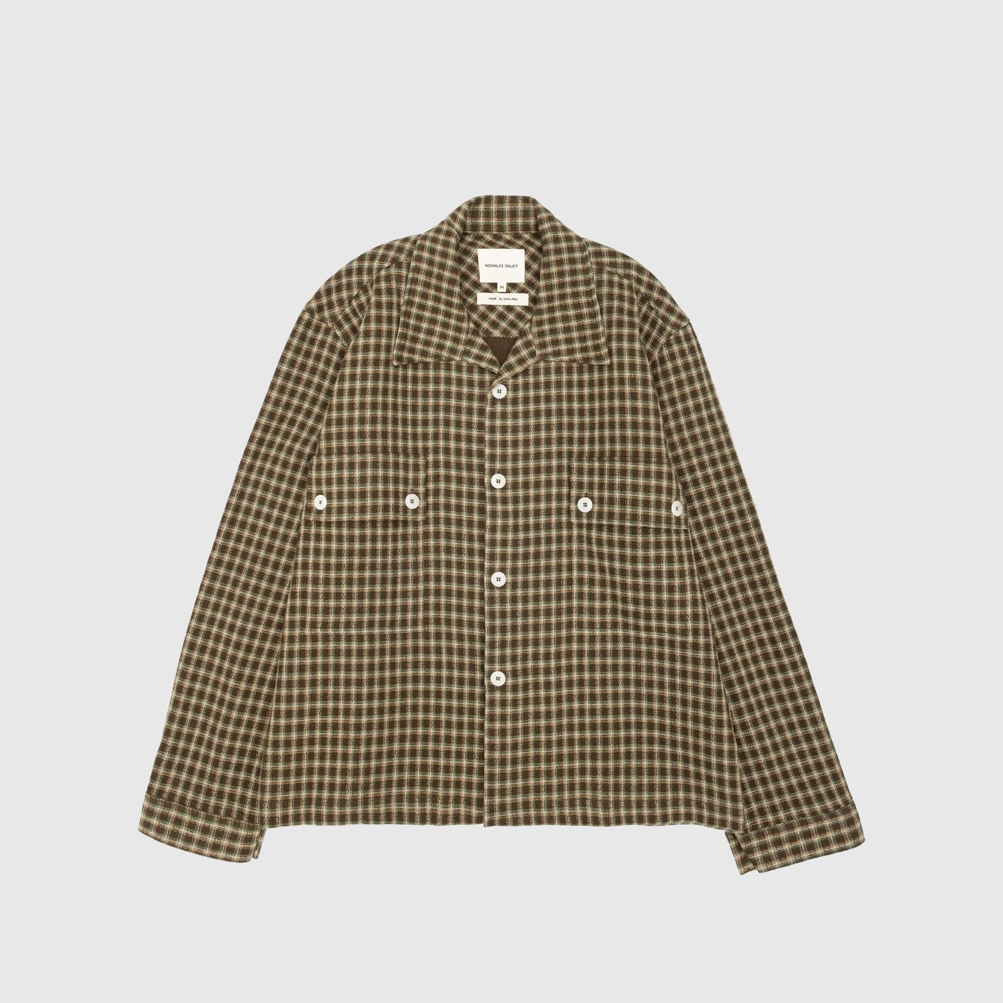 - ND-SS25-FDS-KWC-BRN - Brown Check - 100% Double Face Cotton - Yarn-dyed Kawagashi check made in Japan - Front button closure - Two front chest pockets with flap and button closure - Adjustable button cuffs - Dropped shoulders - Boxy fit - Made in England
