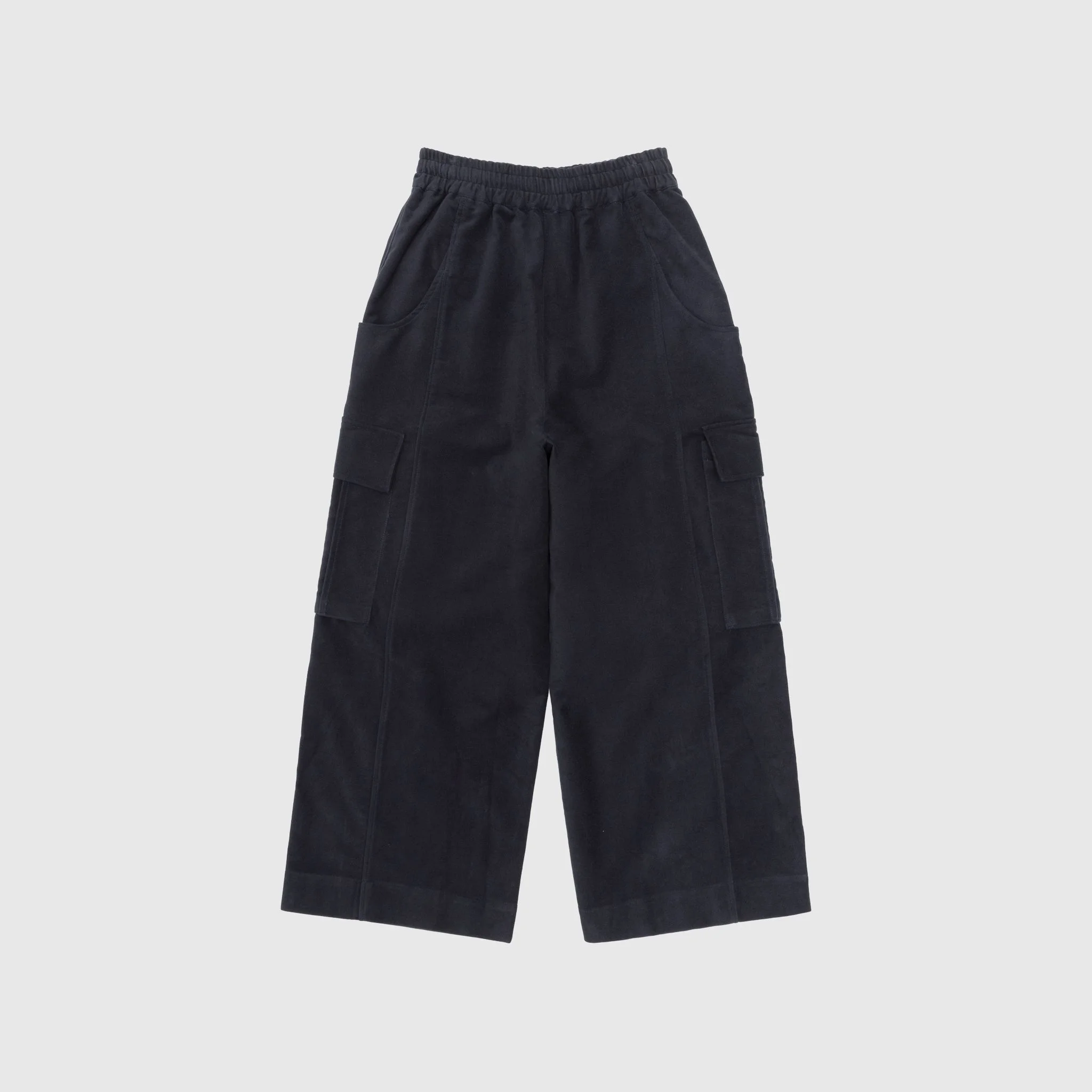 - ND-AW25-WCP-BRP-NVY - Navy - 100% Cotton - Brushed Flannel - Elastic waistband with adjustable drawstring - Two rounded side pockets - Two front-side cargo pockets with a flap closure - One patch pocket in the back with a flap closure - Pleated front - Wide leg - Made in England