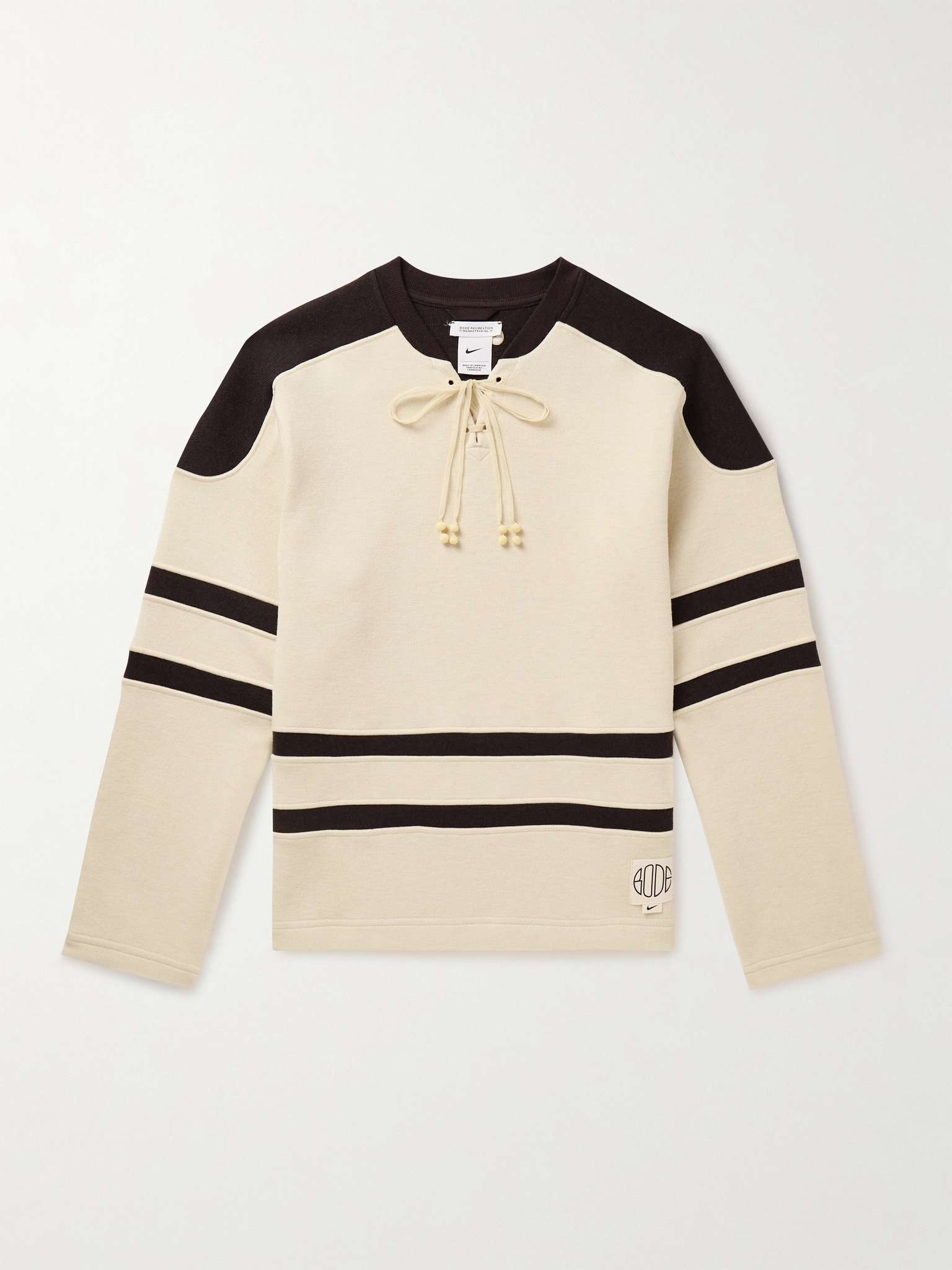 Nike's highly anticipated collaboration with Emily Bode showcases the designer's knack for re-imagining vintage sportswear. Inspired by old-school uniforms, this brushed-jersey sweatshirt is detailed with stitched-in stripes and fastens with heirloom-style, hand-laced ties. Size & Fit - Those who are above 6'1"/ 185cm may wish to take the next size up - Designed for a boxy fit - Mid-weight knit - Model is shown wearing a L - Model measures: chest 38"/ 96cm, height 6'2"/ 182cm Details & Care - Ecru and dark-brown brushed-jersey - 57% polyester, 35% wool, 8% nylon - Dry clean - Designer colour: Ecru/ Shadow Brown