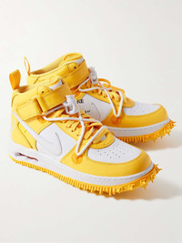 Virgil Abloh's creative legacy continues through Off-White's collaborative work with Nike. The latest 'Air Force 1 Mid' to drop, this 'Varsity Maize' version has two-tone leather uppers complete with Flywire cables, embroidered grim reapers on the heels and spiked rubber soles inspired by track styles. Branded zip-ties and Helvetica text print add a signature finishing touch. Size & Fit - US 4 = UK 3.5/ EU 36 - US 4.5 = UK 4/ EU 36.5 - US 5 = UK 4.5/ EU 37.5 - US 5.5 = UK 5/ EU 38 - US 6 = UK 5.5/ EU 38.5 - US 6.5 = UK 6/ EU 39 - US 7 = UK 6/ EU 40 - US 7.5 = UK 6.5/ EU 40.5 - US 8 = UK 7/ EU 41 - US 8.5 = UK 7.5/ EU 42 - US 9 = UK 8/ EU 42.5 - US 9.5 = UK 8.5/ EU 43 - US 10 = UK 9/ EU 44 - US 10.5 = UK 9.5/ EU 44.5 - US 11 = UK 10/ EU 45 - US 11.5 = UK 10.5/ EU 45.5 - US 12 = UK 11/ EU 46 - US 12.5 = UK 11.5/ EU 47 - US 13 = UK 12/ EU 47.5 - US 13.5 = UK 12.5/ EU 48 - US 14 = UK 13/ EU 48.5 - Packaging reflects both men’s and women’s sizing Details & Care - Yellow, white and black leather - Lace-up and VELCRO® fastening - Designer colour: White/ Varsity Maize - Style number: DR0500-101 - Nike follows its own size guide, therefore the size stated on the box will differ from the one provided in our size chart. To receive your correct fit, please refer to Size & Fit notes