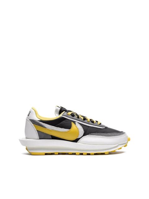 x sacai x Undercover LDWaffle "Bright Citron" sneakers sacai has teamed up with UNDERCOVER on a set of takes on the Nike LDWaffle. Part of a three colourways release, the LDWaffle sneaker features a nylon base accented by overlays of suede and leather that expresses a mix of yellow, black and white. Additional detailing comes in the form of stacked Swoosh logos, dual tongues and matching laces. Rounding up the design of the shoes are printed insoles, thick padded midsoles and contrasting rubber outsoles. Highlights - Black/white/yellow - Calf leather blend - Logo print to the rear - Signature swoosh logo detail - Contrasting panel detail - Round toe - Front lace-up fastening - Logo patch at the tongue - Branded insole - Waffle sole - These styles are supplied by a premium sneaker marketplace. stocking only the most sought-after footwear, they source and curate some of the most hard to find sneakers from around the world. Imported Composition Leather 100% SIZE & FIT Measurement HEEL 1.57 in(4 cm) Sole height 0.98 in(2.5 cm)