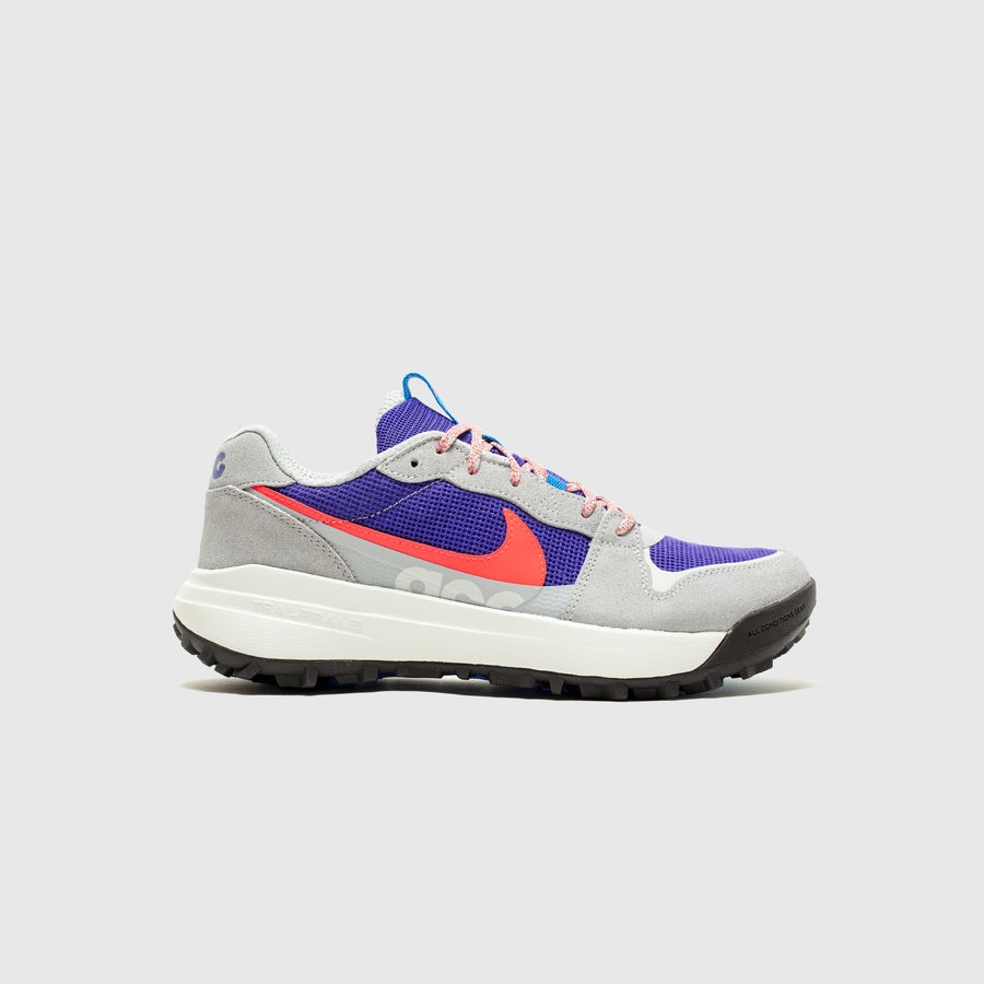 - DM8019 001 - Wolf Grey/Bright Crimson-Indigo Burst - A brand new ACG lifestyle model that contains elements resemblant of models from ACG's past - Wolf grey suede upper with indigo burst loose mesh toe box and side panels - Indigo burst loose mesh tongue with sport blue cloth pull tab and "ACG Triangle" branding - Bright crimson leather swoosh - TRAILFRAME foam midsole - Black rubber outsole - Wolf grey & bright crimson speckled laces