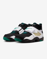 The Air Diamond Turf takes Deion Sanders's signature cross trainer and gives it a street-ready refresh. This version features durable leather, Nike Air cushioning and a midfoot strap for a secure fit. Benefits - Leather upper ages to soft perfection. - Nike Air units in the heel and forefoot provide cushioning with every step. - Rubber outsole adds traction and durability. Product Details - Shown: Black/White/Golden Tussah/Mystic Green - Style: IB2240-001