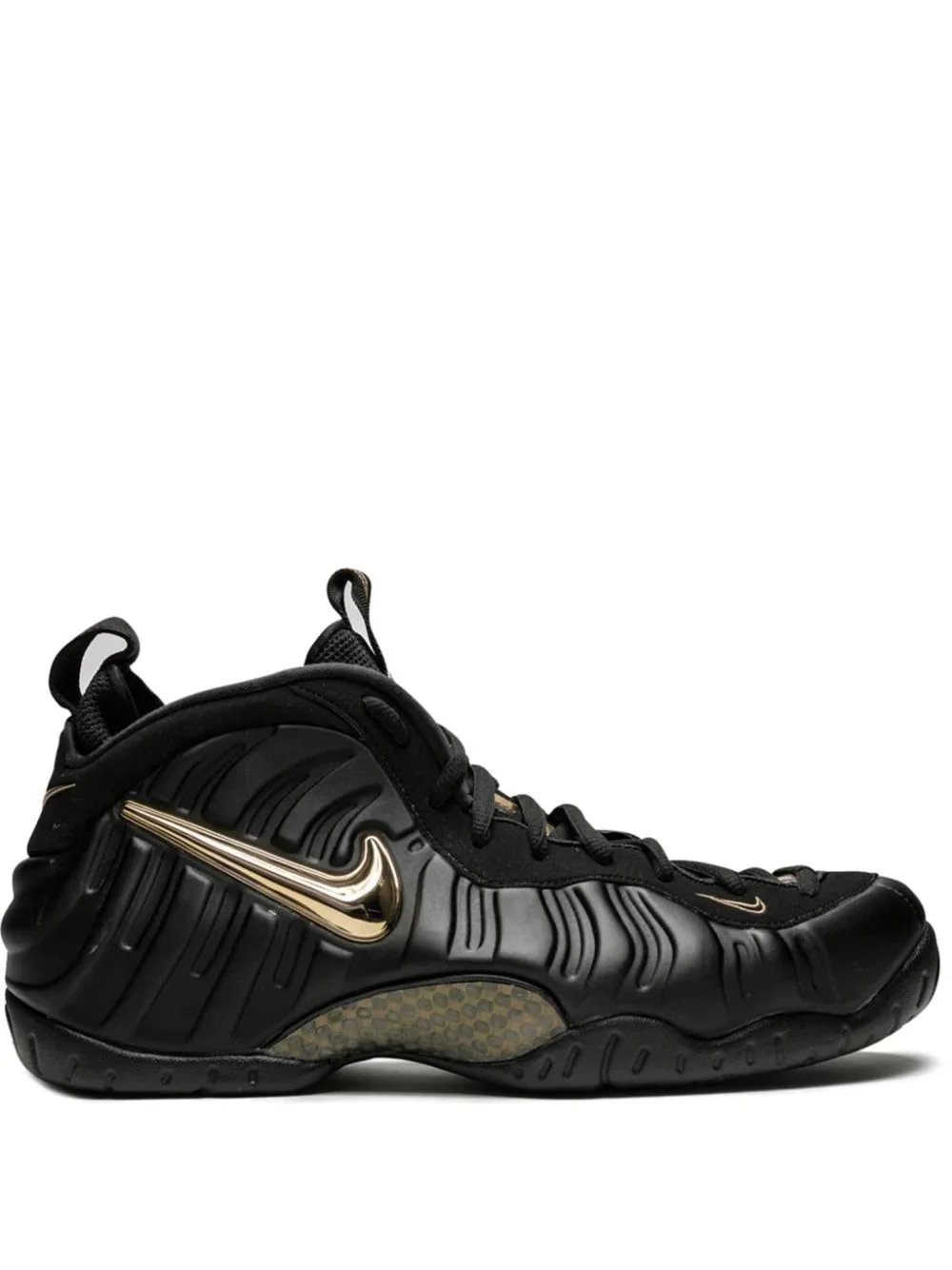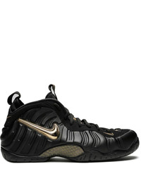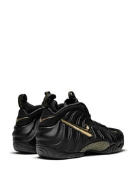 Air Foamposite Pro "Black Metallic Gold" sneakers The Nike Air Foamposite Pro 'Metallic Gold' is a bold showing for the classic basketball shoe that released in the fall of 2018. The sleek and stylish look features a matte black finish on the Foamposite shell. The majority of the upper and the outsole are also done in black. Metallic gold accents on the Swoosh and tongue panel offer the perfect complement to the black sneaker. The black and gold checkered treatment on the carbon fiber midfoot plate completes the impressive colourway. Highlights - Black - Leather - Debossed detailing - Signature swoosh logo detail - Round toe - Front lace-up fastening - Pull tab at the heel - Logo patch at the tongue - Flat rubber sole - Release date: autumn 2018 - These styles are supplied by a premium sneaker marketplace. stocking only the most sought-after footwear, they source and curate some of the most hard to find sneakers from around the world. Imported Composition Outer: Leather 100% Sole: Rubber 100% Lining: Polyester 100%