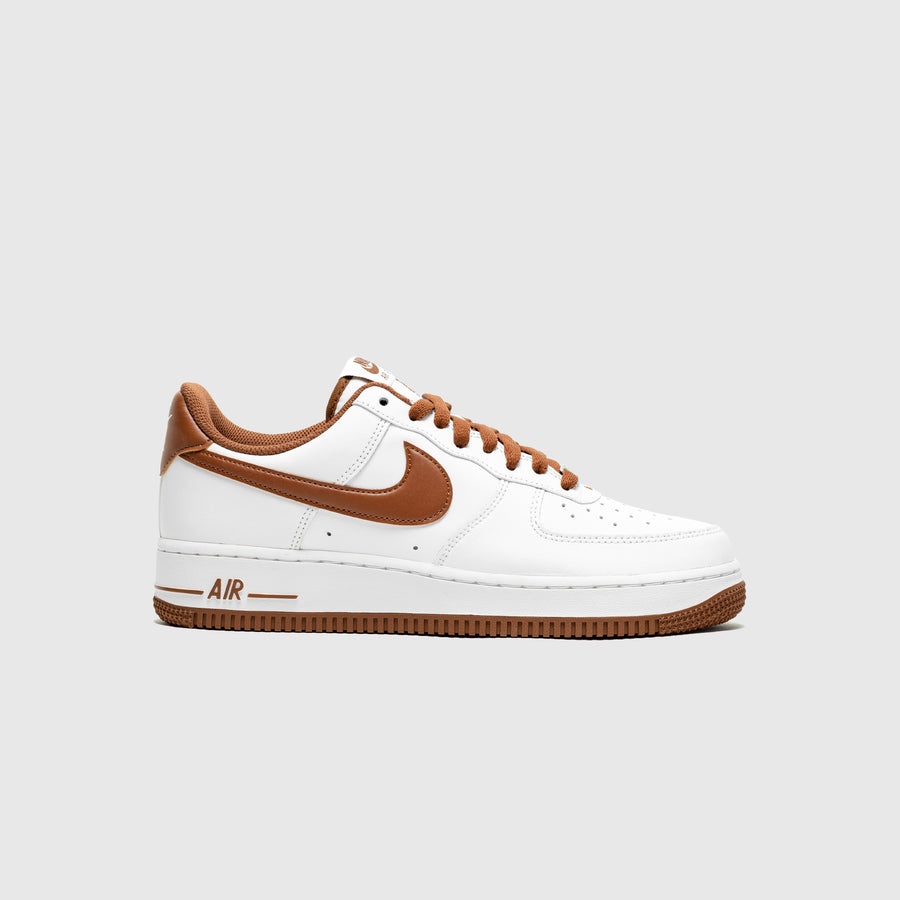 - DH7561 100 - White/Pecan-White - One of Nike's most iconic models done up in a classic white base and accent color colorblocking - White leather upper - White nylon canvas tongue with pecan border and "NIKE AIR FORCE 1" tongue tag - Pecan leather swoosh - Pecan leather heel tab with white "NIKE AIR" embroidery - White rubber midsole with encapsulated "AIR" unit in the heel - Pecan rubber outsole