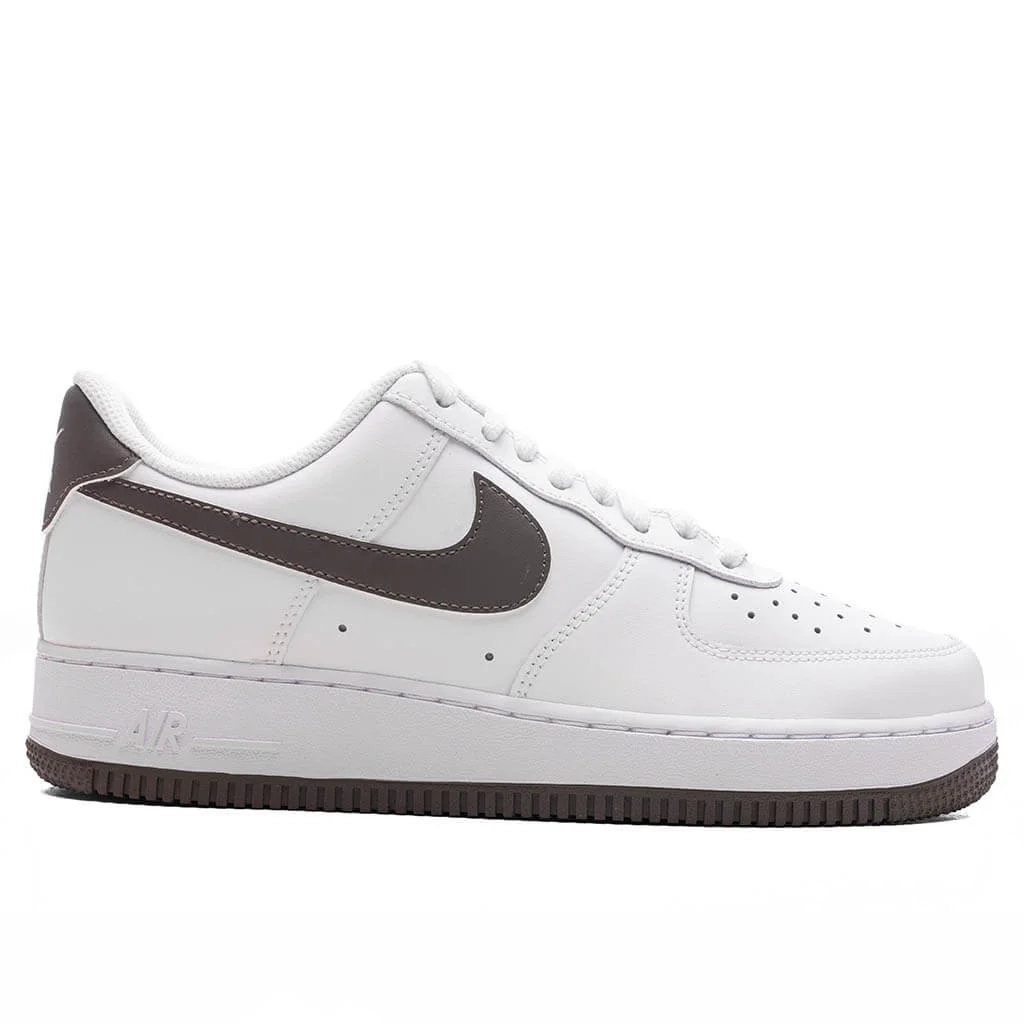 A timeless staple since its debut in 1982, the Nike Air Force 1 '07 delivers classic style and everyday comfort. This version features an all-leather upper in a clean White and Cave Stone colorway, complemented by a perforated toe box for breathability. Finished with the signature Air cushioning in the heel for responsive support and a rubber outsole for lasting traction. - Leather upper - Perforated toe box - Rubber outsole - Air cushioning in heel - All sizes listed in U.S. Mens sizing unless stated otherwise - Style no: FJ4146-118
