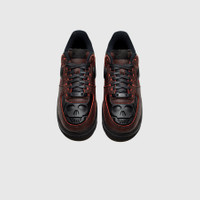 - HV2016 001 - Black/Black-Crimson - Nike continues its tradition of Halloween models, this time adding spooky touches to the Air Force 1. - Black speckled leather upper - Black speckled leather overlays - Black speckled leather tongue with "NIKE AIR FORCE 1" tongue tag - Black molded swoosh - Black molded skull on the toe box - Black suede heel cap with "NIKE AIR" branding - Black midsole with encapsulated "AIR" unit in the heel - Black rubber outsole