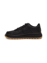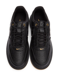 Low-top paneled grained leather sneakers in black. · Perforated detailing at toe · Lace-up closure · Embossed logo at padded tongue · Padded collar · Tonal Swoosh appliqué at sides · Embossed logo at heel tab · Tonal mesh lining · Contrast stitching in tan at textured rubber midsole · Treaded rubber outsole in tan Supplier color: Black/Bucktan/Gum yellow Upper: leather. Sole: rubber.