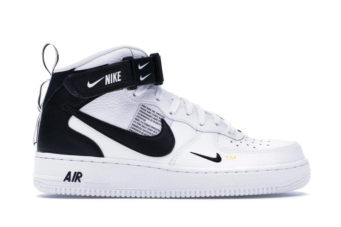 The Nike Air Force 1 Mid Utility White Black is a mid-top silhouette in a white and black-tour yellow color palette. The "White Black" Nike Air Force 1 Mid Utility features an upper that is primarily composed of leather, ensuring durability and longevity. The sneaker has a strap closure system, featuring Nike branding, that provides a secure fit and additional support. In addition, the shoe's cushioned midsole with Nike Air technology ensures comfort and shock absorption. The rugged outsole, designed with a multidirectional traction pattern, offers grip and durability. The perforated toe box allows for ventilation. Each of the shoe's side panels is embroidered with an oversized Nike Swoosh and a smaller Nike Swoosh. The heel strap also displays Nike branding, and there is "AIR" lettering on the midsole. The standout feature of the sneaker is its bold design, featuring a crisp white leather upper accented with black overlays and detailing and a unique strapping system across the midfoot. The Nike Air Force 1 Mid Utility White Black was released on November 1, 2018, and sold for an initial price of $115. - Style 804609-103 - Colorway White/Black-Tour Yellow - Retail Price 115 - Release Date 2018-11-01 - Featured false - Product Line Nike Air Force