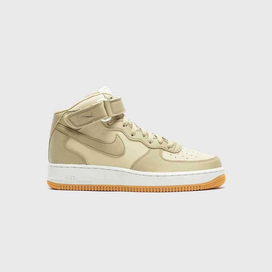 - DV7585 200 - Limestone/Limestone-Rattan-Summit White - One of Nike's most iconic models done up in it's mid-cut iteration with some special materials - Limestone & rattan premium leather upper - Limestone nylon tongue with "NIKE AIR FORCE 1" tongue tag - Limestone leather swoosh - Limestone leather heel cap with embossed "NIKE AIRE" branding and ankle strap for additional support - White rubber midsole with encapsulated "AIR" unit in the heel - Gum rubber outsole - Classic flat laces