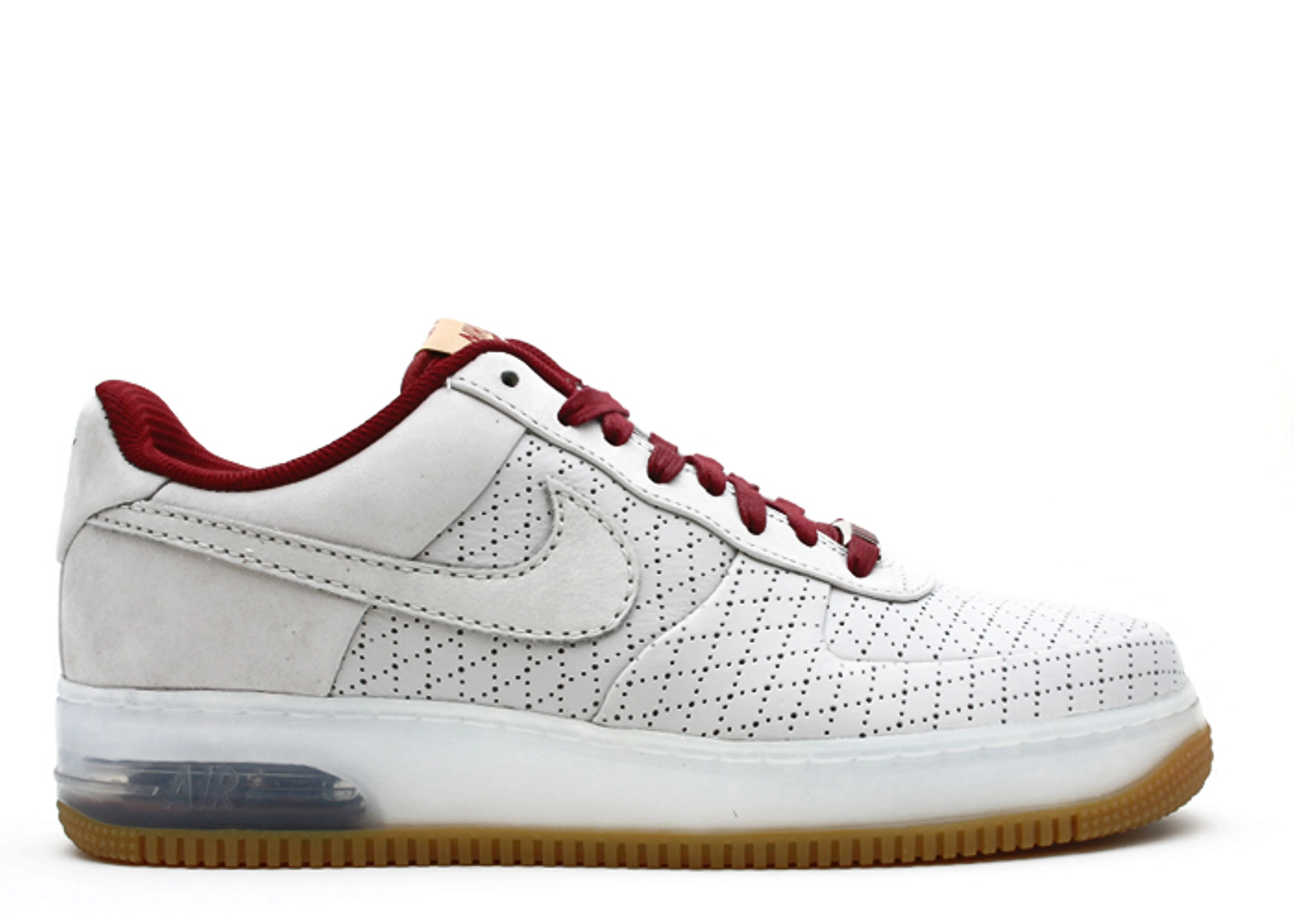 This Nike Air Force 1 Supreme Max Air shoes have a Cleveland Cavaliers-inspired colorway with luxury details. This 2009 version closely resembles a 2008 LeBron James signature model with a grey, red and white on the upper, replacing the 'L23' signoff in favor of a 'Nike Air' logo. A diamond-perforated upper, see-through Max Air unit and a gum rubber outsole complete the look. SKU: 318772 003 Colorway: Ntrl Grey/Ntrl Grey Tm Red White