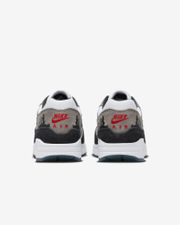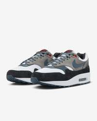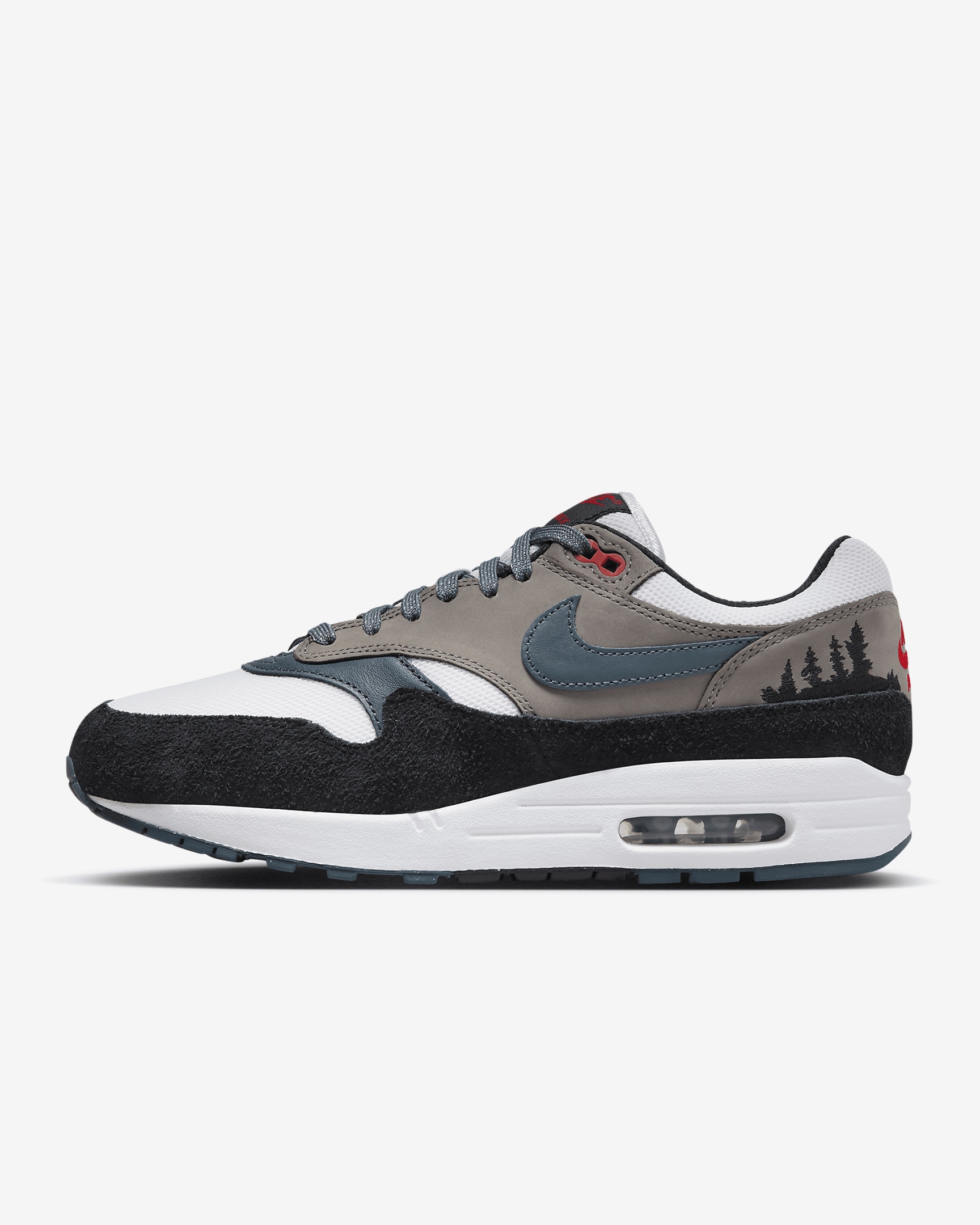 Get away and immerse yourself. The Air Max 1 "Escape" pairs classic running DNA with Pacific Northwest-inspired details. The striking colors were pulled from an iconic Nike running ad—one that featured Mount St. Helens' caldera billowing in the background. An embroidered forest scene at the heel is worthy of wanderlust. And the rugged suede accents, airy textile and boot-inspired laces finish your look. Time to escape. Benefits - Upper combines suede and textile for a durable yet lightweight design. - Plush and comfortable, Max Air cushioning has just the right amount of support. - Rubber Waffle outsole adds durable traction and heritage styling. - Padded, low-cut collar feels soft and comfortable. - Shown: White/Black/Soft Grey/Slate Blue - Style: FJ0698-100