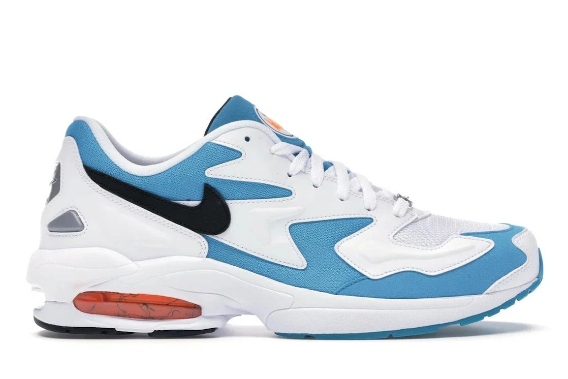 The Nike Air Max2 Light Blue Lagoon is a specific variation of Nike's Air Max2 sneaker dressed in White, Black, Blue Lagoon, and Laser Orange colors. The Light Blue Lagoon Nike Air Max2 design features a vibrant Blue Lagoon colorway, adding a bold and eye-catching touch. The Air Max2 Light utilizes a dual-pressure Air-Sole unit within the heel, ensuring cushioning and optimal impact absorption during activities. The shoe's unique lacing system offers a secure fit, while the padded collar and tongue enhance overall comfort. The rubber outsole incorporates a durable tread pattern for reliable traction on various surfaces. The Black-dressed Nike Swoosh on the lateral sides and Nike Air and Air Max brandings on the tongue and heel cap are concluding the design. What we love about this Nike Air Max2 Light Blue Lagoon is its mesh and synthetic materials, providing breathability and support for all-day comfort. During its release on 17th January 2019, this sneaker retailed at $140. - Style AO1741-100 - Colorway White/Black-Blue Lagoon-Laser Orange - Retail Price 140 - Release Date 2019-01-17 - Featured false - Product Line Nike Air Max